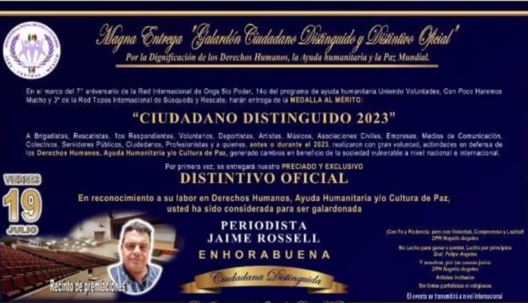 Xalapa,Ver.,- a 21 de Junio de 2024.- La Red Internacional de las ONGS 5TO Poder con sede en Mรฉxico, otorgarรก el prรณximo 19 de julio el preciado galardรณn โCiudadano Distinguido 2023โ a Jaime Mรฉndez Domรญnguez, director general de Esmeralda Radio Digital.