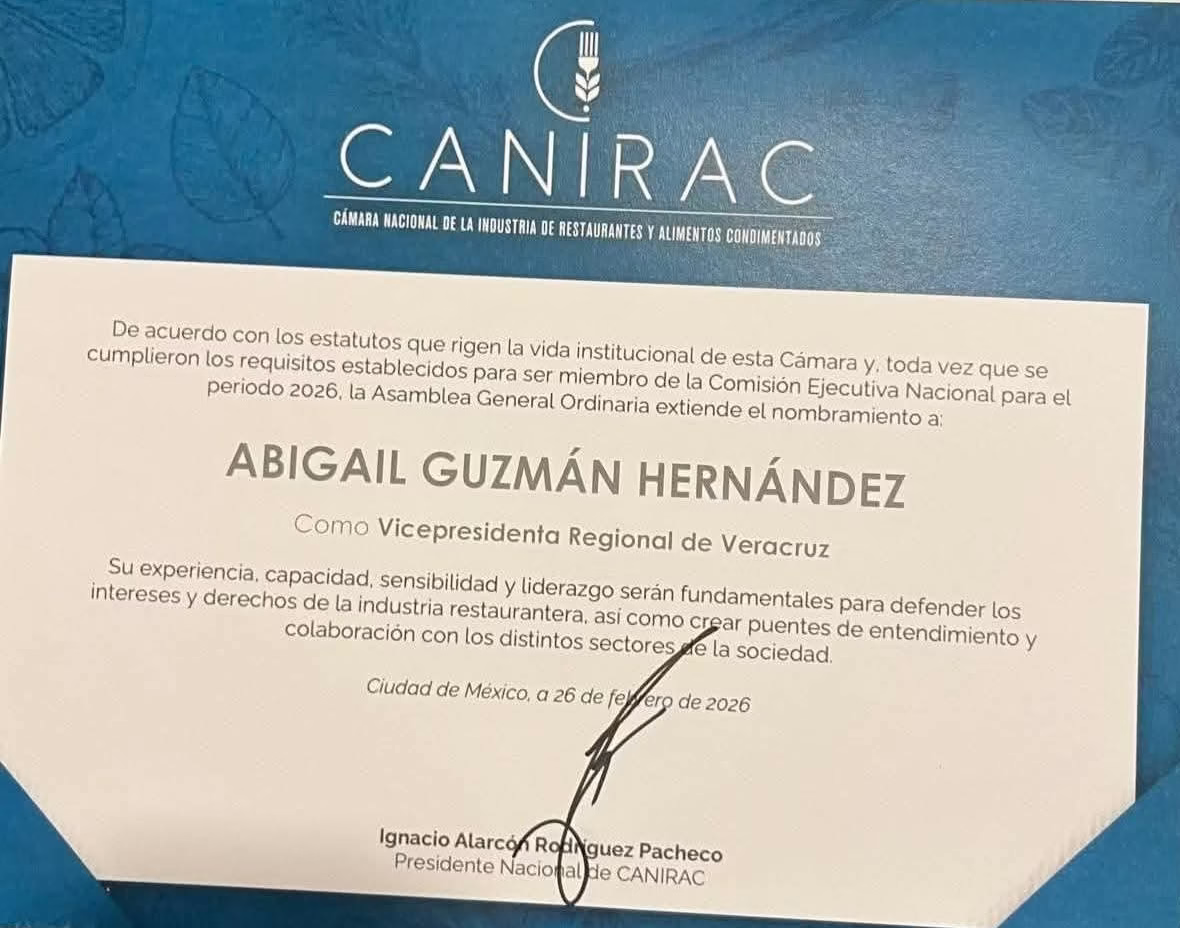 La Presidenta en Veracruz de la Cámara Nacional de la Industria Restaurantera y Alimentos Condimentados, Abigail Guzmán Hernández, fue nombrada también miembro de la Comisión Ejecutiva Nacional para el periodo 2026, con el reconocimiento de la asamblea general.