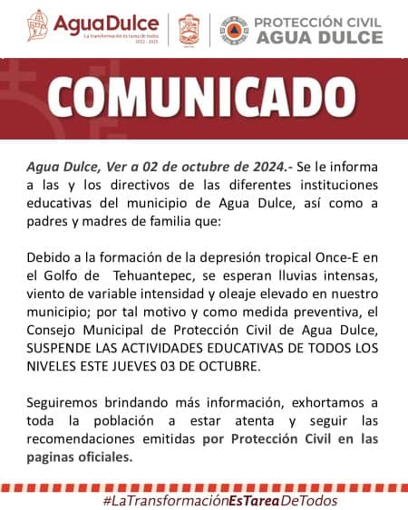 Ante la emergencia, se ha decidido suspender las clases y labores educativas en todos los niveles escolares. Esta medida busca garantizar la seguridad de la población, especialmente de los estudiantes que podrían verse expuestos a situaciones de riesgo debido a las inundaciones.
