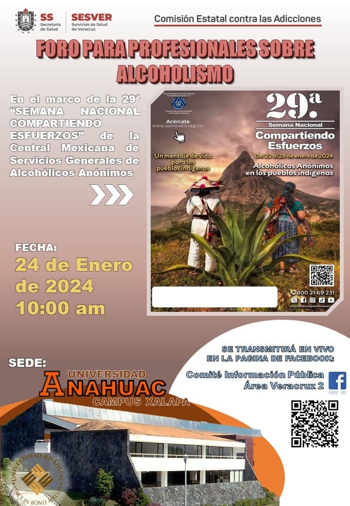 Para el día miércoles 24 de enero actual, tienen programado llevar a cabo un foro y de información en las instalaciones de la UNIVERSIDAD ANÁHUAC, en dónde estarán participando, personal de la propia institución educativa, autoridades de la Secretaria de Salud del gobierno del estado de Veracruz, quienes coordinan el CONSEJO ESTATAL CONTRA LAS ADICCIONES, este Consejo Estatal agrupa a muchas instalaciones que trabajan en favor de prevenir el alcoholismo y otras adicciones.