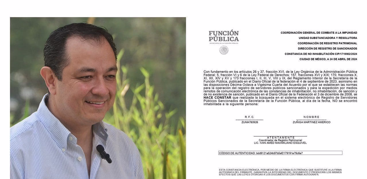 Xalapa, Ver., 25 de abril de 2024.- Américo Zúñiga Martínez NO se encuentra inhabilitado, confirmó la Secretaría de la Función Pública a través de la Constancia de No Inhabilitación CIP/1719902/2024.
