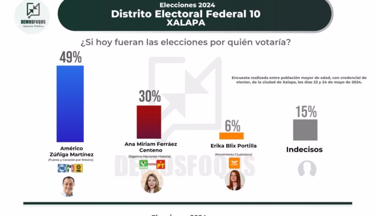 Xalapa, Ver., 27 de mayo de 2024.- El candidato de la coalición Fuerza y Corazón por México a la diputación federal por Xalapa, Américo Zúñiga Martínez tiene casi el 50 por ciento de las preferencias ciudadanas, de acuerdo con la más reciente encuesta de DEMOSFOQUS.