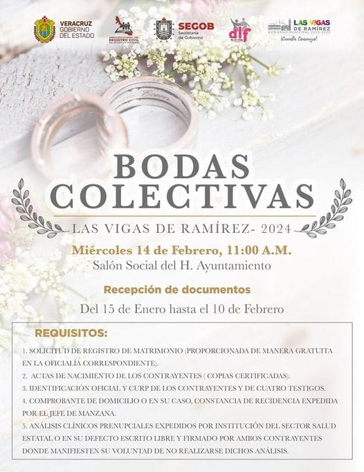 Para participar en las Bodas Colectivas 2024, los interesados deberán presentar su documentación en el Registro Civil Las Vigas de Ramírez. El período de recepción de documentos se llevará a cabo desde el 15 de enero hasta el 10 de febrero. Es importante destacar que no se cobrará ningún costo por la realización de este trámite.