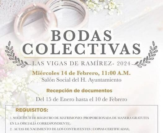 El H. Ayuntamiento de Las Vigas de Ramírez 2022-2025, en colaboración con el Registro Civil de Las Vigas de Ramírez y el DIF Municipal, se complace en anunciar la realización de las «Bodas Colectivas 2024» el próximo 14 de febrero. Este evento brinda a las parejas la oportunidad de unirse en matrimonio de manera colectiva y gratuita.