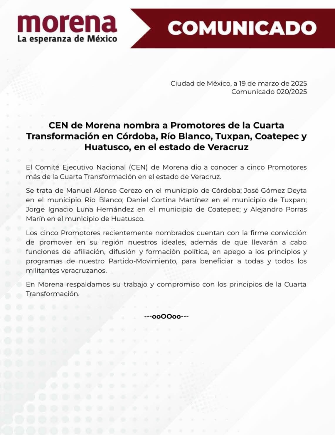 El Comité Ejecutivo Nacional (CEN) de Morena ha anunciado la designación de cinco nuevos promotores de la cuarta transformación en varios municipios del estado de Veracruz. Este nombramiento busca fortalecer la presencia y los ideales del partido en la región, favoreciendo así a los militantes veracruzanos.