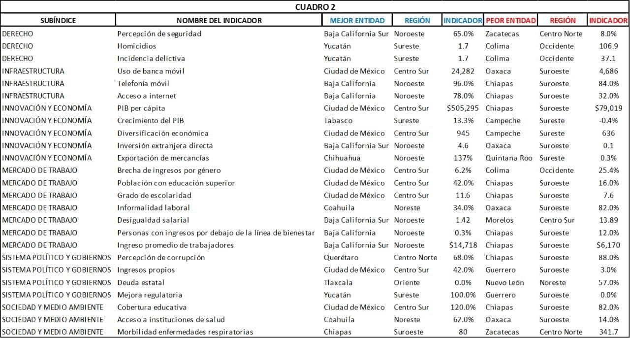 La comparación regional nace del propio análisis IMCO, contrastando los mejores y peores estados, seleccionando 25 de 50 indicadores, de los 6 subíndices.