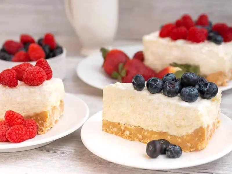 - Retira el cheesecake de yogur griego y refrigéralo por al menos dos horas antes de desmoldar y servir.
