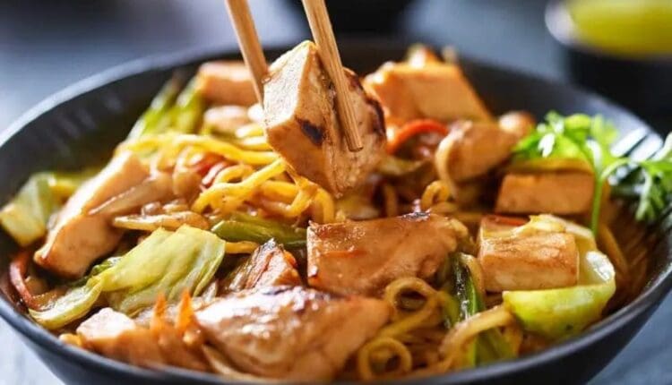 Delicioso yakisoba de pollo, una comida callejera japonesa para cambiar el ramen