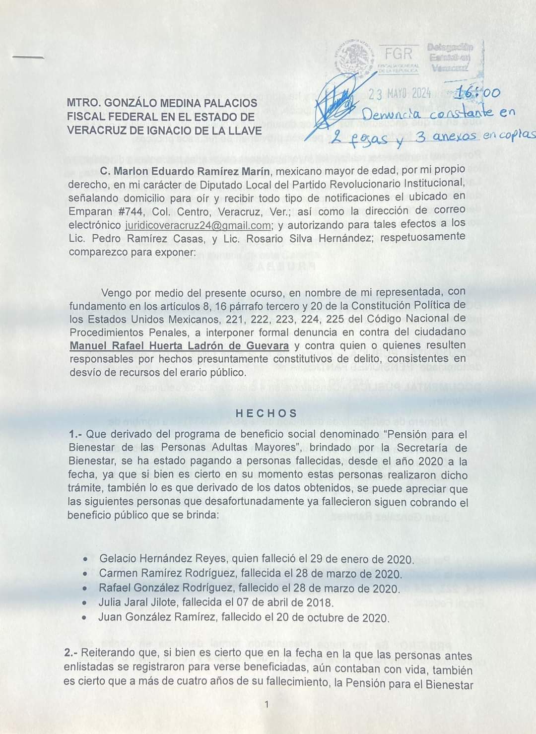 Veracruz, Ver., 23 de mayo de 2024. El diputado local priista, Marlon Ramírez Marín, interpuso ante la Fiscalía General de la República una denuncia en contra de Manuel Huerta Ladrón de Guevara, exdelegado estatal de la Secretaría del Bienestar, y contra quienes resulten responsables, por desvío de recursos del programa Pensión para el Bienestar de Personas Adultos Mayores.
