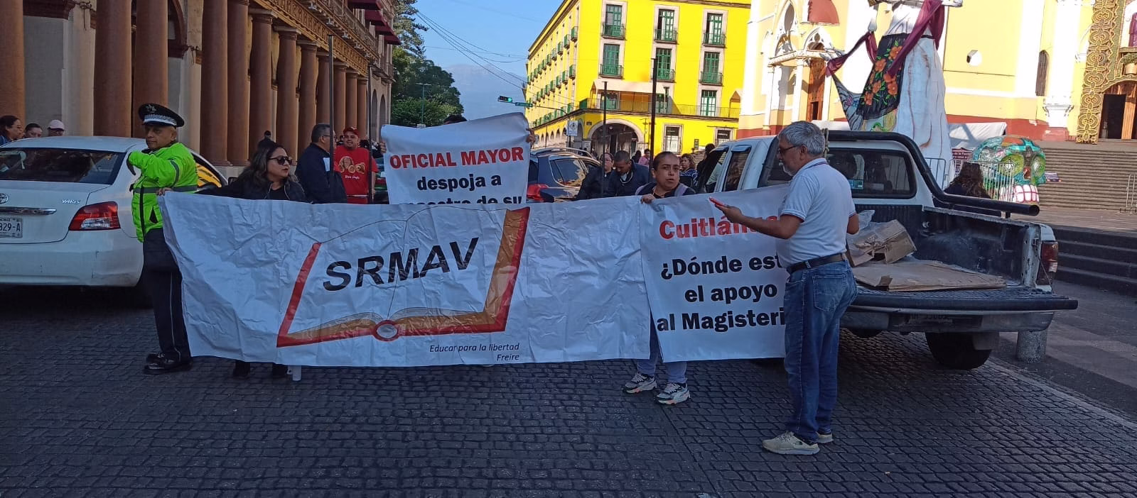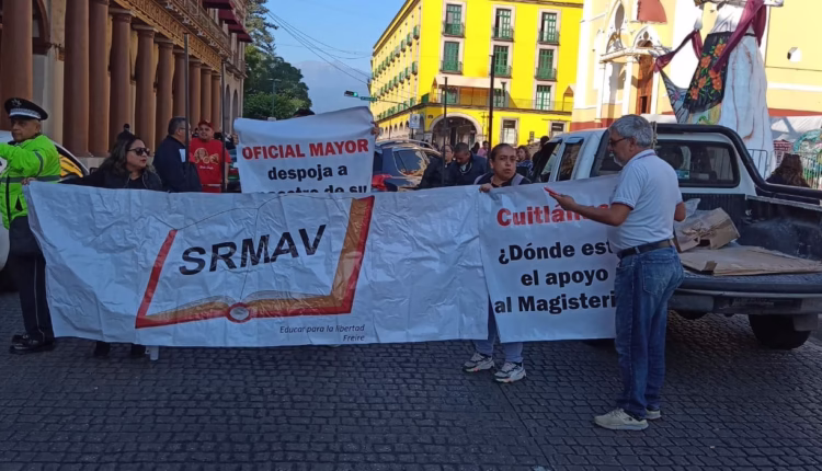 Xalapa, Ver. &- Agremiados del Sindicato Renovador Magisterial Veracruzano, se manifestaron en protesta por el despojo que pretenden hacer la autoridad educativa de la plaza docente a uno de sus integrantes.