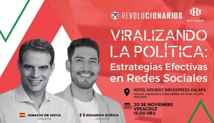 Xalapa, Ver.,14 de noviembre de 2023. El Partido Revolucionario Institucional, a través del Instituto de Formación Política Jesús Reyes Heroles, invitan al curso: “Viralizando la política”, estrategias efectivas en redes sociales, impartido por los consultores Ignacio de Moya y Eduardo Zúñiga; la cita es el próximo lunes 20 de noviembre a las 15:00 horas en Hotel Holiday Inn Express, ubicado en Ignacio Zaragoza No. 8, zona centro en Xalapa.
