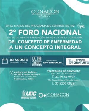 Organiza el Colegio Nacional de Consejeros y la Universidad del Conde de Veracruz, el segundo Foro Nacional en Salud Mental, Prevención de Adicciones y Consejería, denominado “del concepto de enfermedad a un concepto integral”, como parte del novedoso programa “Centros de Paz”, creado e implementado con bastante éxito por el mismo CONACON. Este importante Foro se llevará a cabo el próximo 3 de agosto, en la Ciudad de Guadalajara, Jalisco.