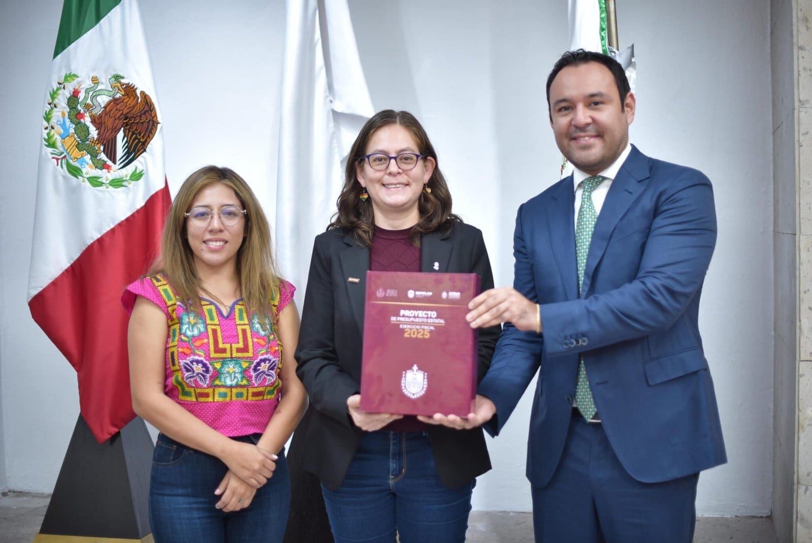 En nombre de la LXVII Legislatura, la presidenta de la Mesa Directiva, diputada Tanya Carola Viveros Cházaro, recibió de manos del titular de la Secretaría de Finanzas y Planeación (Sefiplan), José Luis Lima Franco, el Proyecto del Presupuesto Estatal para el Ejercicio Fiscal 2025.