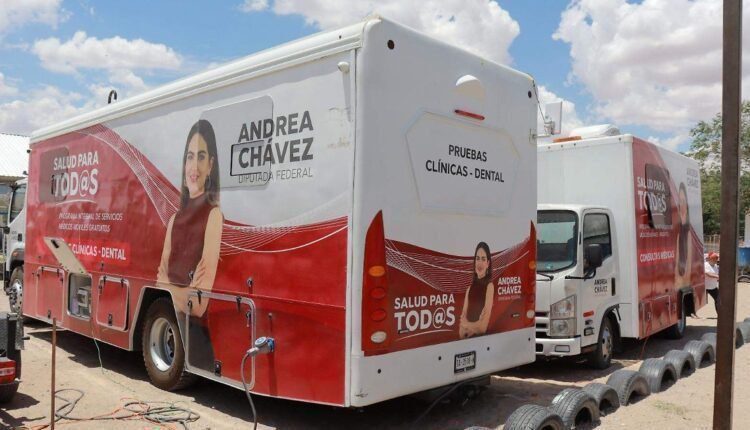 Estos contratos de salud itinerante, se cubrieron con el uso de camiones que -precisamente- son iguales a los que hoy trae Andrea Chávez en su campaña de salud y en los que está impreso su rostro.