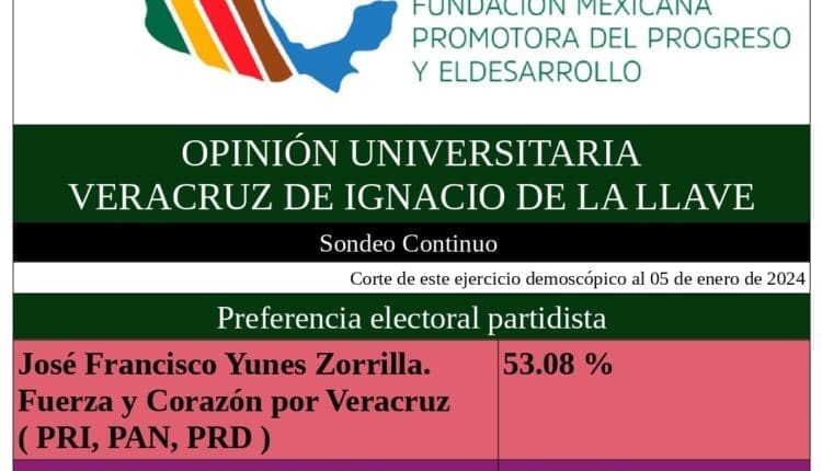 La Fundación Mexicana Promotora del Progreso y el Desarrollo (Fundarmex) en su medición del 5 de enero muestra que al inicio de las precampañas rumbo a la elección gubernamental de este año, el aspirante por la coalición Fuerza y Corazón por Veracruz, José Francisco Yunes Zorrilla, Pepe Yunes, inicia con una ventaja de más de 11 puntos sobre su competidora, Rocío Nahle García, postulada por la Cuarta Transformación.