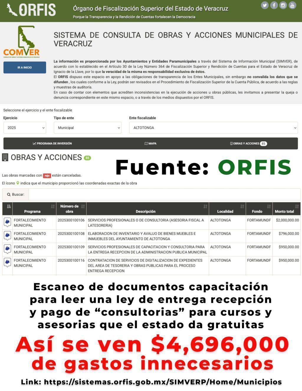De igual forma en la página oficial del Órgano de Fiscalización Superior del Estado de Veracruz (ORFIS) aunado a lo anterior se pueden apreciar gastos superiores a los cuatro y medio millones de pesos, ya que también la comuna de Altotonga pagó Novecientos Cincuenta mil pesos por concepto de Servicios Profesionales de Capacitación y Consultoría para la entrega recepción de la Administración pública municipal. Se logra apreciar otros dos pagos uno por Setecientos Noventa y Seis mil y otro por Novecientos Cincuenta mil, cuyos conceptos comprenden Elaboración de Inventario y Avalúo de Bienes Muebles e Inmuebles del ayuntamiento de Altotonga y Contratación de Servicios de Digitalización de Expedientes del Área de Tesorería y Obras Públicas para el Proceso Entrega Recepción, respectivamente. Todas dentro del Programa de Fortalecimiento Municipal y con fondos del FORTAMUNDF.