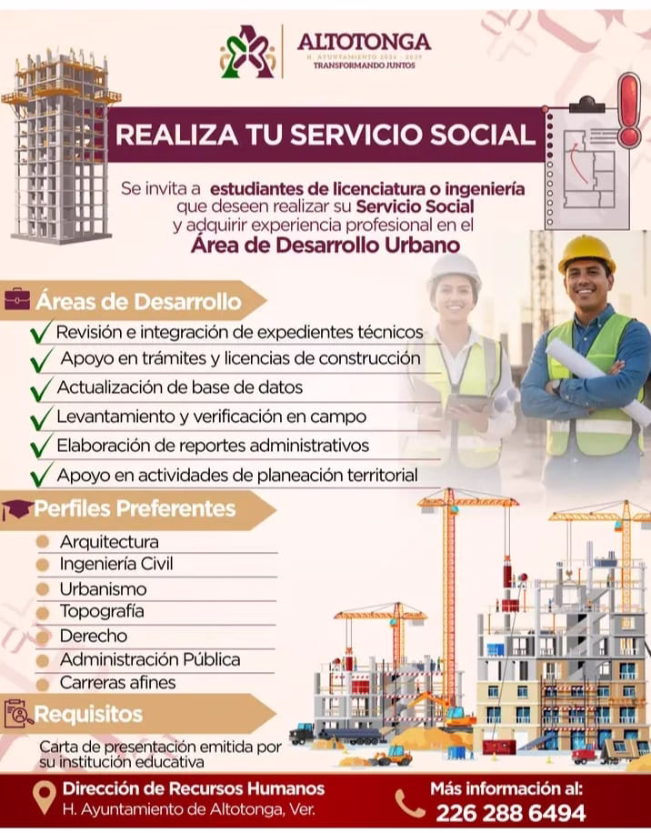 El Ayuntamiento de Altotonga invita cordialmente a las y los estudiantes de licenciatura o ingeniería a realizar su servicio social en el área de Desarrollo Urbano, donde podrán adquirir experiencia profesional y fortalecer sus conocimientos participando en proyectos y actividades que contribuyen al desarrollo integral del municipio.