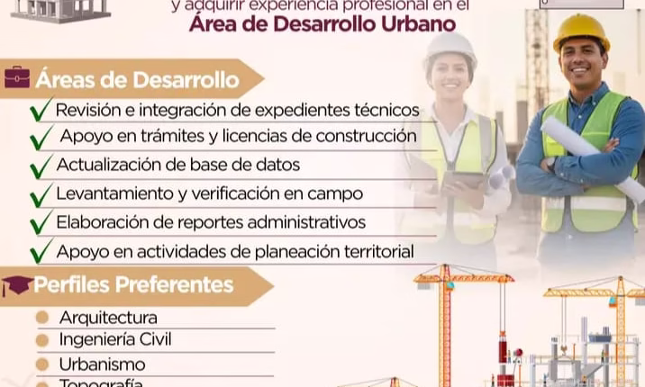 El Ayuntamiento de Altotonga invita cordialmente a las y los estudiantes de licenciatura o ingeniería a realizar su servicio social en el área de Desarrollo Urbano, donde podrán adquirir experiencia profesional y fortalecer sus conocimientos participando en proyectos y actividades que contribuyen al desarrollo integral del municipio.