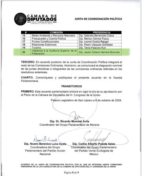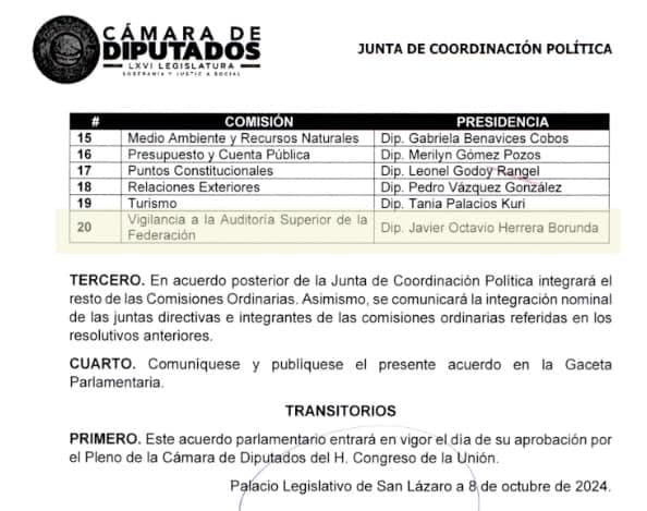 Este acuerdo parlamentario fue aprobado en el pleno de la Cámara de Diputados y entrará en vigor de inmediato, consolidando la participación del diputado Herrera Borunda en uno de los órganos clave para el control y vigilancia del gasto público.