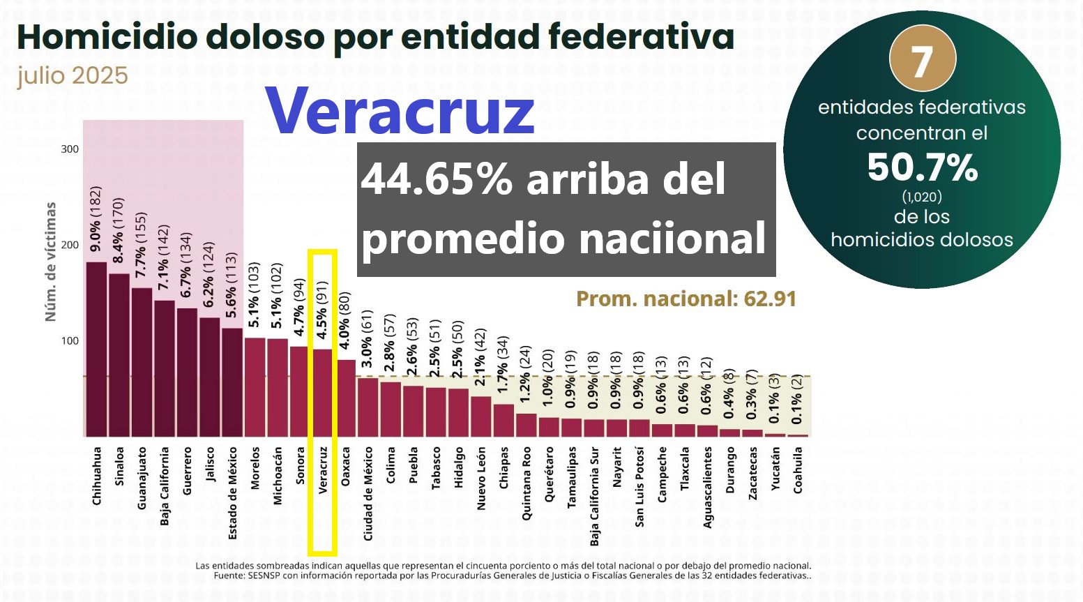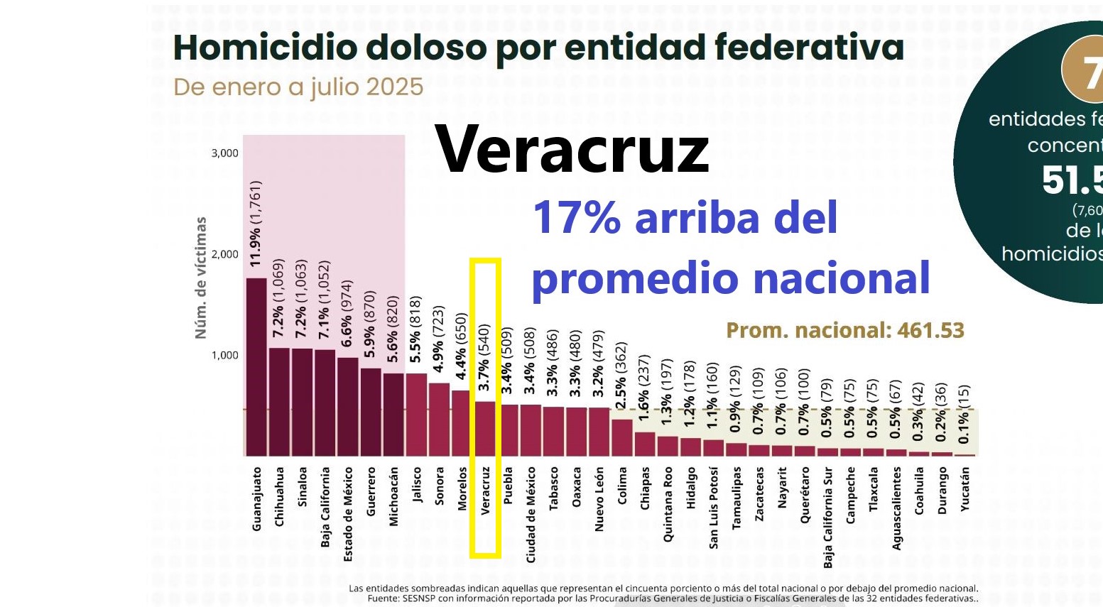 Más no sólo fue en julio de 2025, sino que el promedio por arriba de lo nacional se ha repetido mes con mes, lo que hace que de enero a julio de 2025, Veracruz tenga un 17% más que el promedio del país.