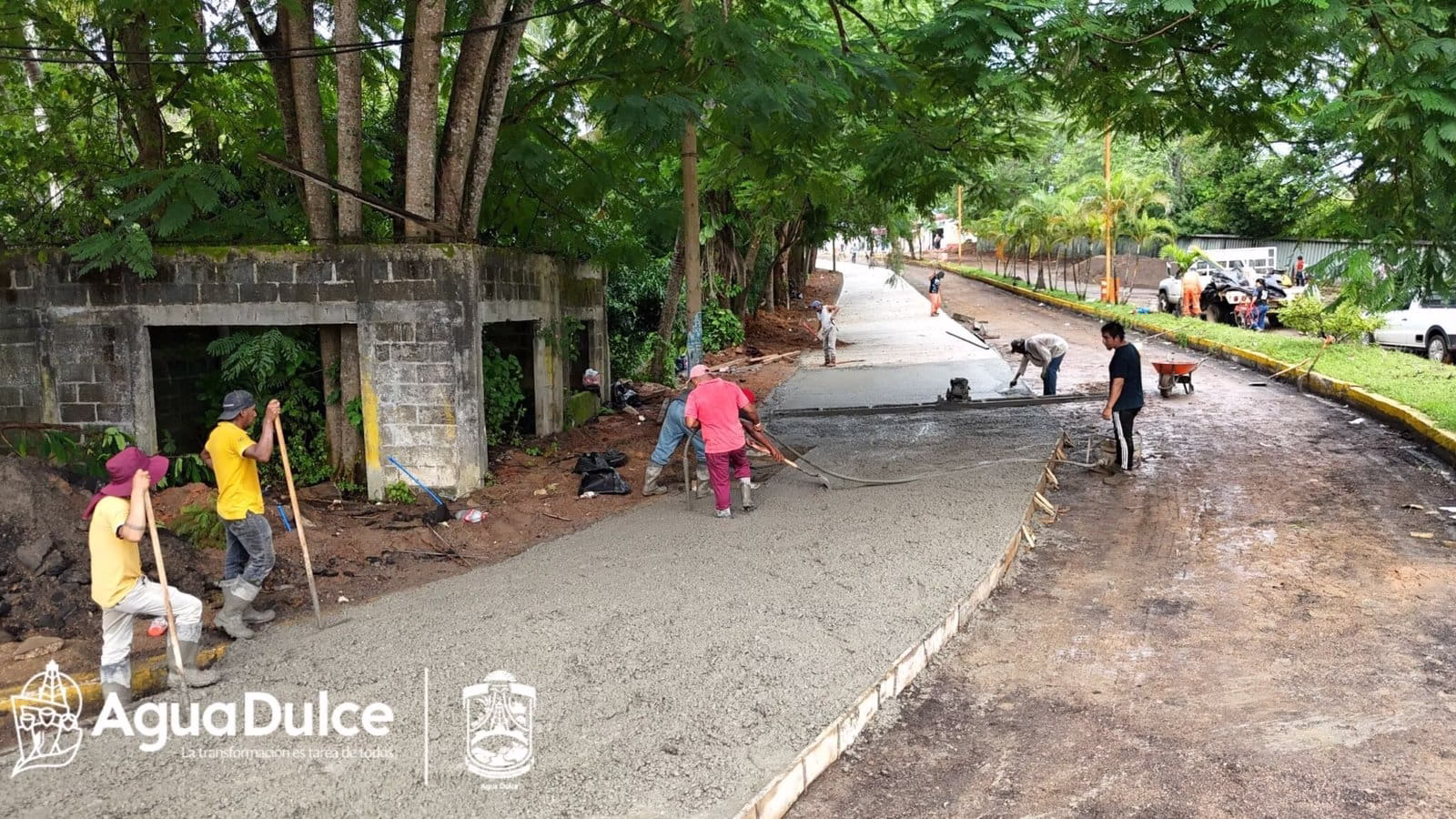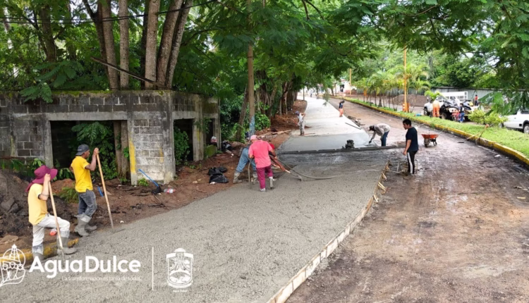 Agua Dulce, Ver.- Con obras que transforman el gobierno del alcalde Noé Castillo Olvera continúa trabajando de manera permanente en la magna obra de pavimentación con concreto hidráulico MR42 de la Avenida Transístmica, la cual cuenta con un avance del 70% de su construcción total, importante avenida en el municipio de Agua Dulce.