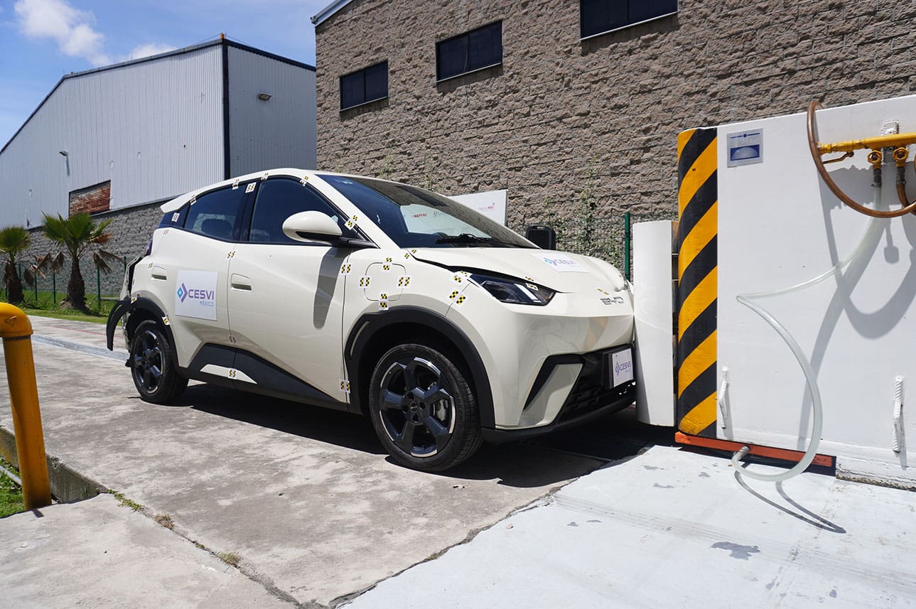 Toluca, México, 12 de septiembre de 2024. CESVI MÉXICO, (Centro de Experimentación y Seguridad Vial) llevó a cabo las pruebas de impacto frontal y trasera del vehículo 100% eléctrico, BYD Mini Dolphin 2024, en sus instalaciones de esta ciudad.