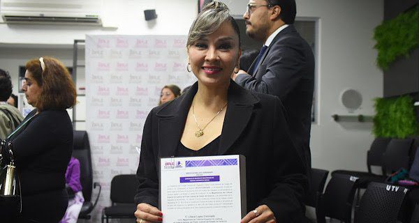 Liliana López recibe del OPLE su constancia de mayoría como Magistrada en Materia Familiar.