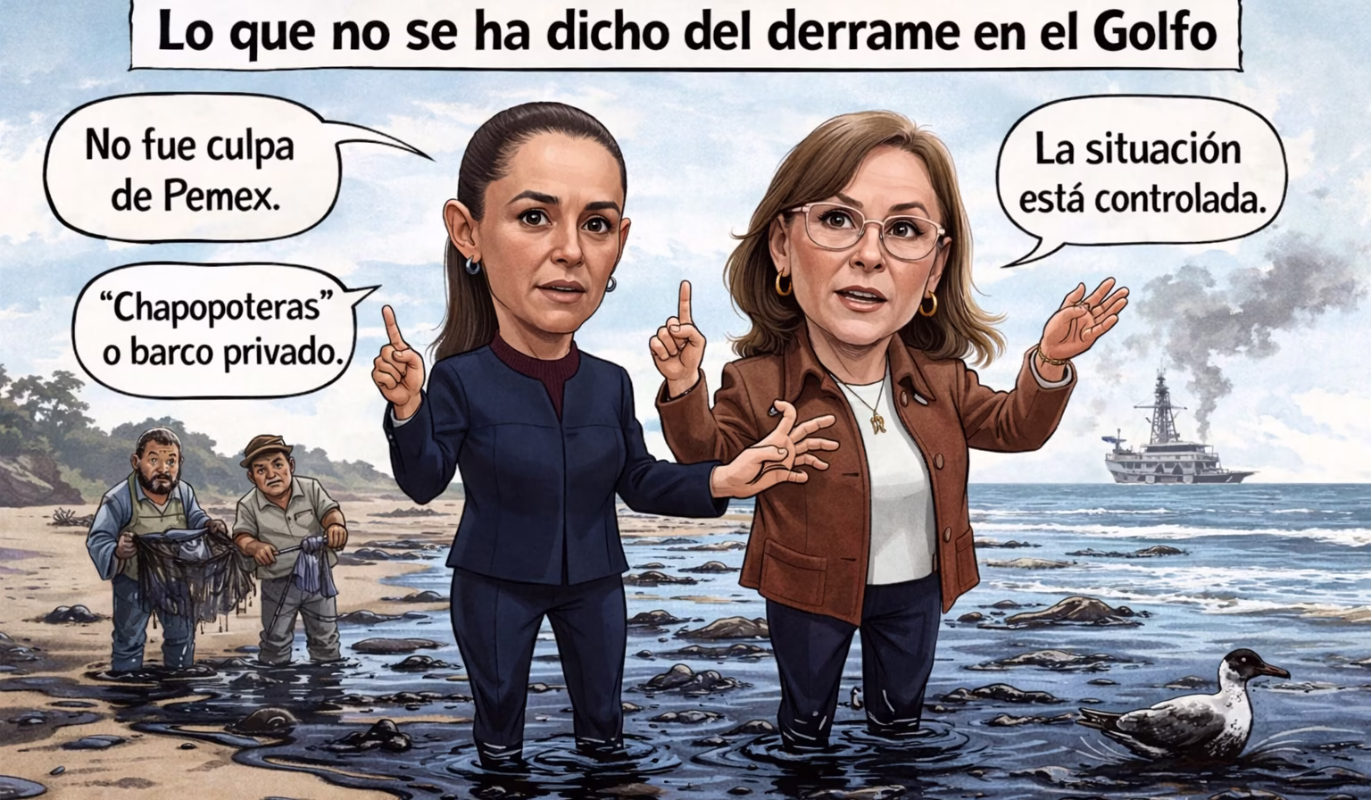 Hace unos días, la presidenta Claudia Sheinbaum informó sobre el derrame, descartando inicialmente la responsabilidad de Petróleos Mexicanos y sugiriendo otras causas: desde emanaciones naturales —las llamadas “chapopoteras”— hasta la posible participación de una embarcación privada. En paralelo, desde el ámbito local, figuras como Rocío Nahle han sostenido líneas discursivas similares. El resultado: una coreografía política donde las versiones coinciden demasiado pronto, mientras las preguntas fundamentales siguen sin respuesta.