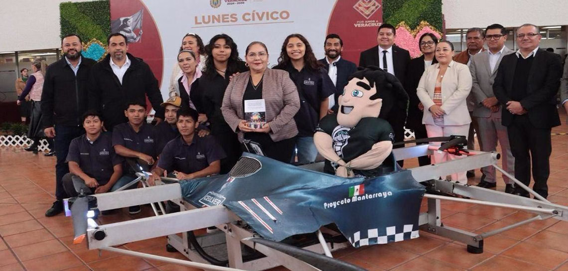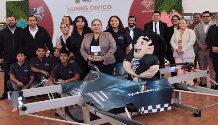 Xalapa, Ver., abril de 2025.- Alumnos y docentes que participaron en la creación del proyecto Mantarraya, prototipo de aeronave tripulada, realizaron una demostración de su funcionamiento ante autoridades de la Secretaría de Educación de Veracruz (SEV), en el marco del Lunes Cívico.