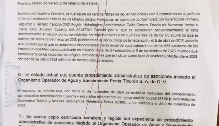 El monto de la multa que Conagua impuso a Residencial Punta Tiburón asciende a 5 millones 532 mil 700 pesos, al comprobarles 46 irregularidades plenamente documentadas, siendo oficialmente notificados a liquidar el monto a la mayor brevedad posible.
