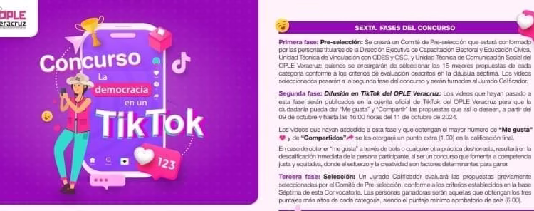 Xalapa, Veracruz, 30 de julio de 2024. En sesión extraordinaria, el Consejo General del Organismo Público Local Electoral del Estado de Veracruz (OPLE Veracruz) aprobó la emisión de la convocatoria del concurso “La democracia en un tiktok”.
