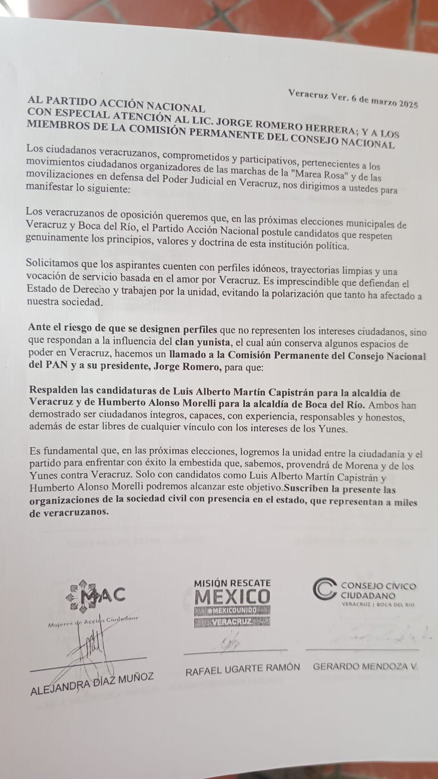 Las organizaciones que respaldaron el movimiento en favor de los candidatos del PAN Humberto Alonso Morelli y Alberto Martín capistran, son la Unión Nacional de Padres de Familia, Mujeres de Acción Ciudadana, Poder ciudadano, Veracruz Unido, iniciativa ciudadana Veracruz, Desarrollos Sustentables de Comunitario Bienestar, Ánimos por ti, Muévete, Mexicanos Fuertes, Frente Nacional por la Familia, Misión Rescate México, Consejo Cívico Ciudadano Veracruz Boca del Río, Quinientocracia Veracruz