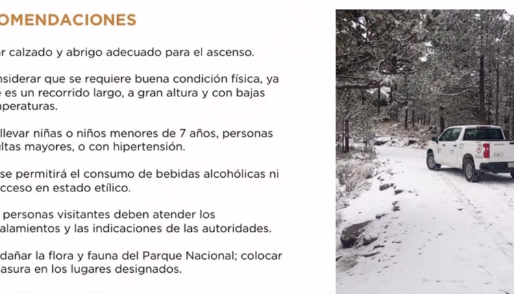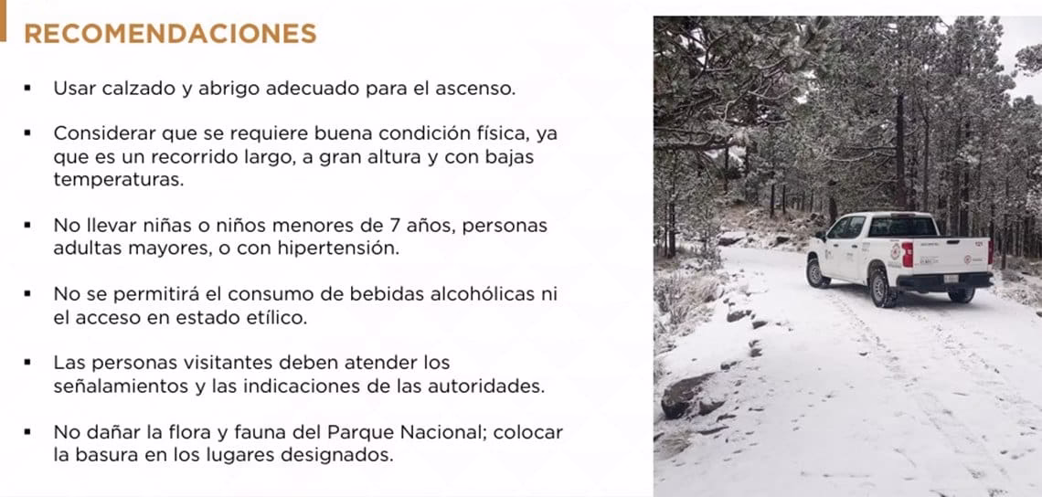 Usar ropa térmica y calzado adecuado; no llevar a menores de 7 años, adultos mayores o personas con enfermedades crónicas; abstenerse de consumir bebidas alcohólicas, cuidar la flora y fauna y depositar la basura en lugares designados; ante cualquier emergencia, reportarla de inmediato a la línea de emergencias 911.