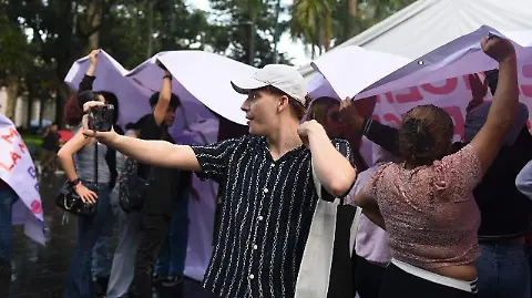 Manifestantes desplegaron pancartas con acusaciones de acoso; hubo empujones y confrontaciones bajo la lluvia.