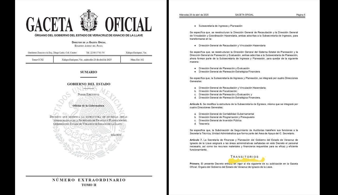 Xalapa, Ver. 24 abril 2025.- Mediante decreto publicado en la Gaceta Oficial del Estado este miércoles 24 de abril, la Gobernadora de Veracruz, Rocío Nahle García comenzó con la reestructuración de áreas administrativas al interior de la Secretaría de Finanzas y Planeación del Gobierno del Estado de Veracruz (SEFIPLAN).
