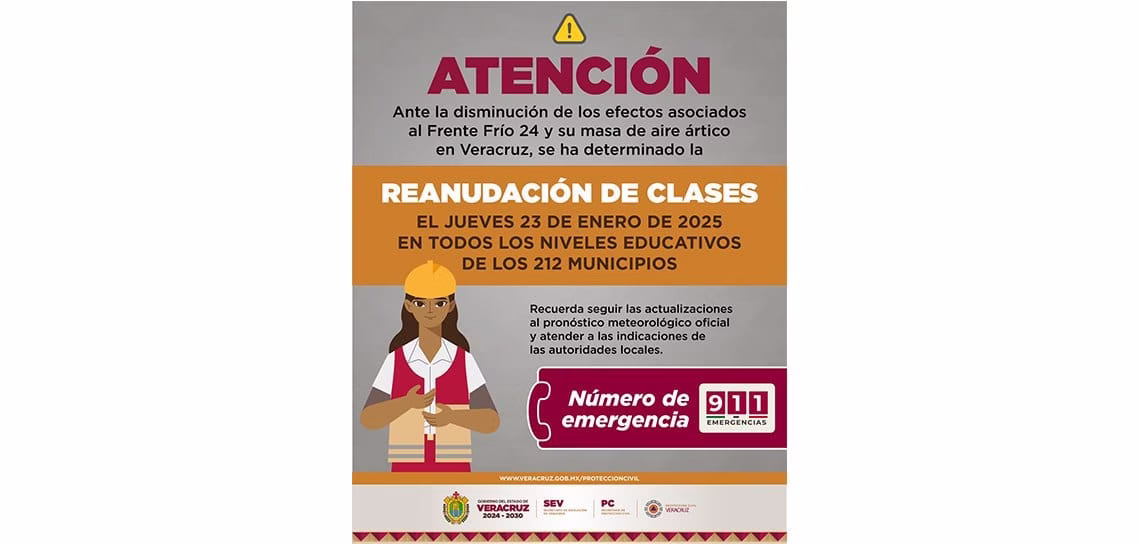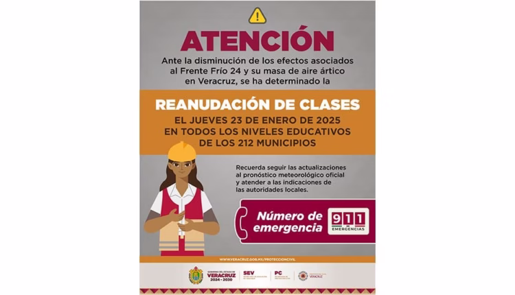 Xalapa, Ver., miércoles 22 de enero de 2025.- El Gobierno del Estado a través de las Secretarías de Educación y de Protección Civil, dieron a conocer que este jueves 23 de enero se reactivan las actividades educativas en todos los niveles educativos de los 212 municipios veracruzanos.