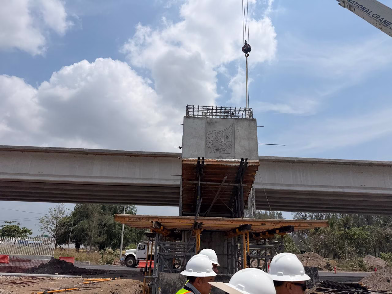 Asimismo, se mantiene el montaje de trabes y paralelamente, se realizan labores de formación de base en la vialidad principal, así como trabajos de terracerías y rellenos en los accesos al puente.