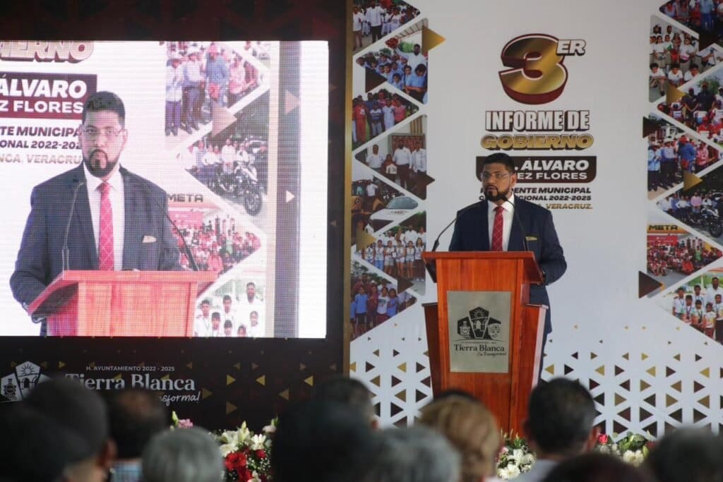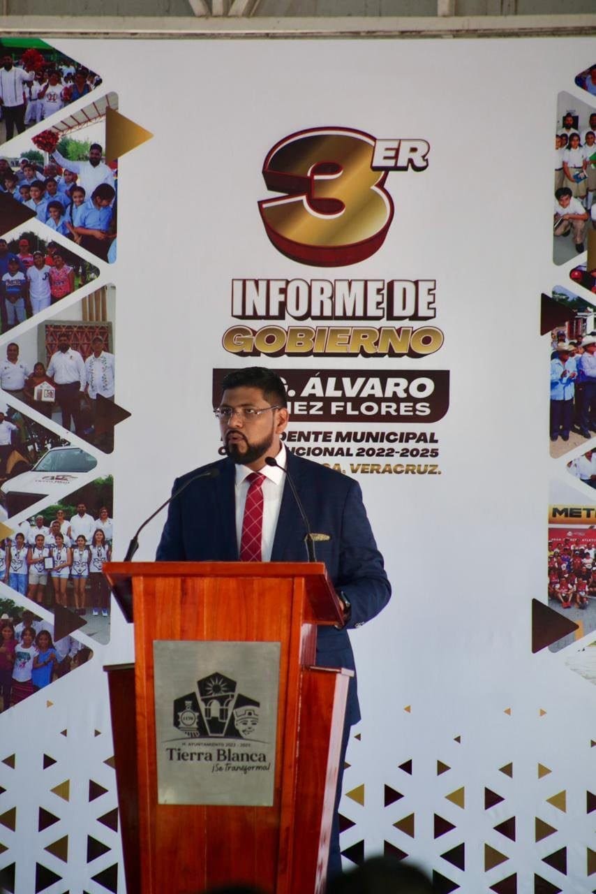 El Presidente Municipal de Tierra Blanca, Ing. Álvaro Gómez Flores, presentó su Tercer Informe de Gobierno, destacando los avances alcanzados en 2024 en áreas clave como infraestructura, seguridad, bienestar social y desarrollo económico. Durante su intervención, reafirmó el compromiso de su administración con una gestión transparente, inclusiva y orientada a mejorar la calidad de vida de los terrablanquenses.